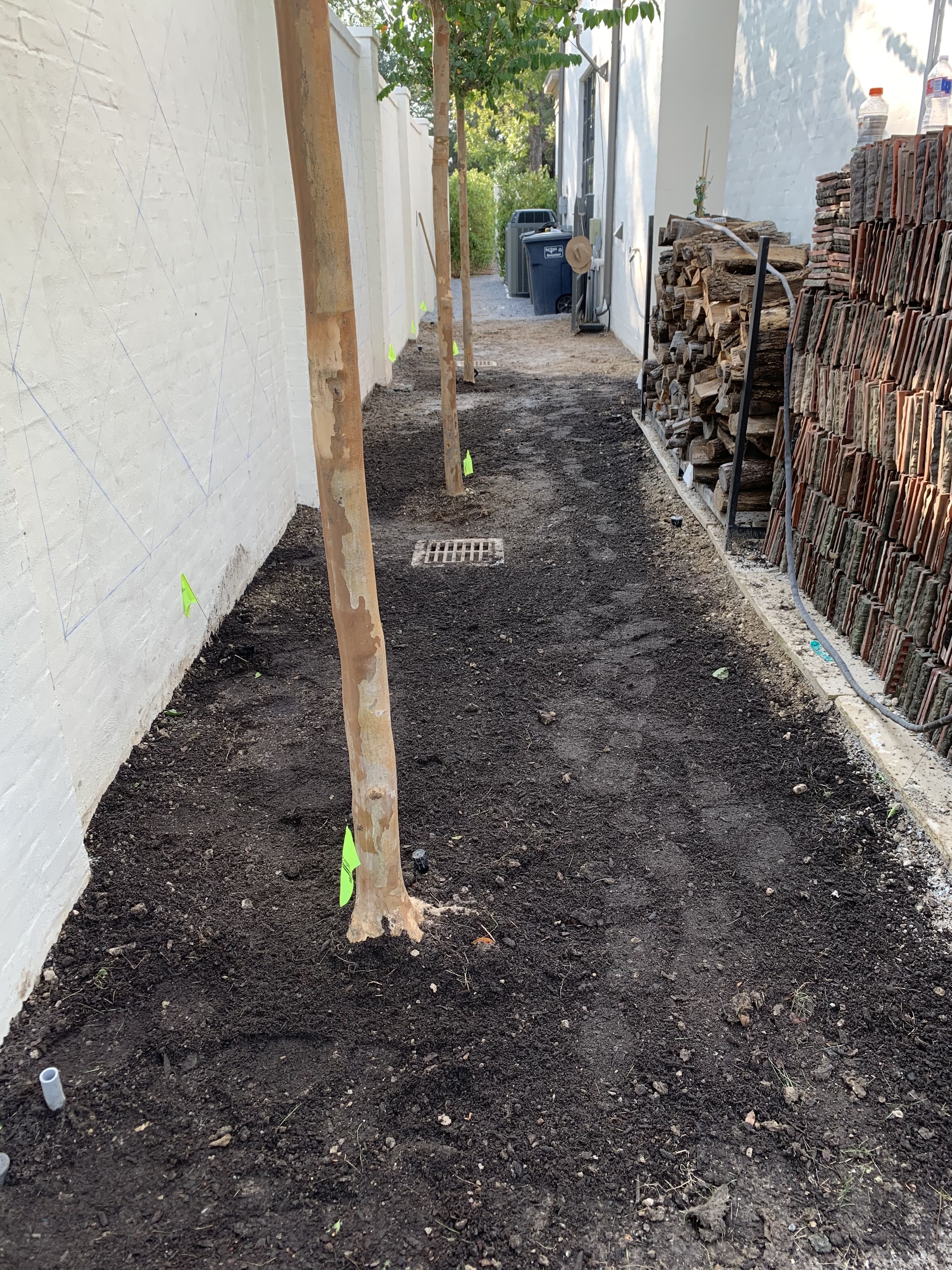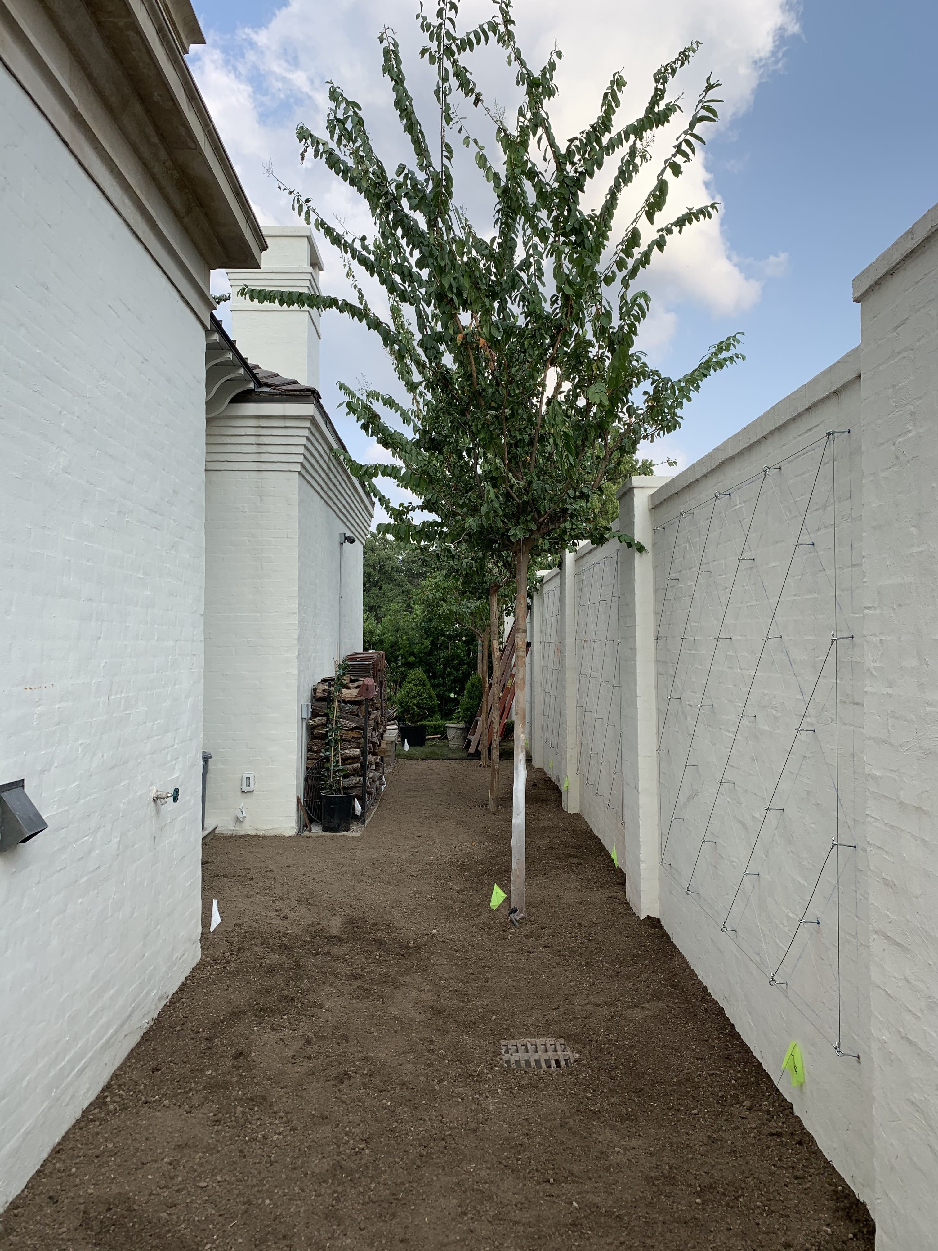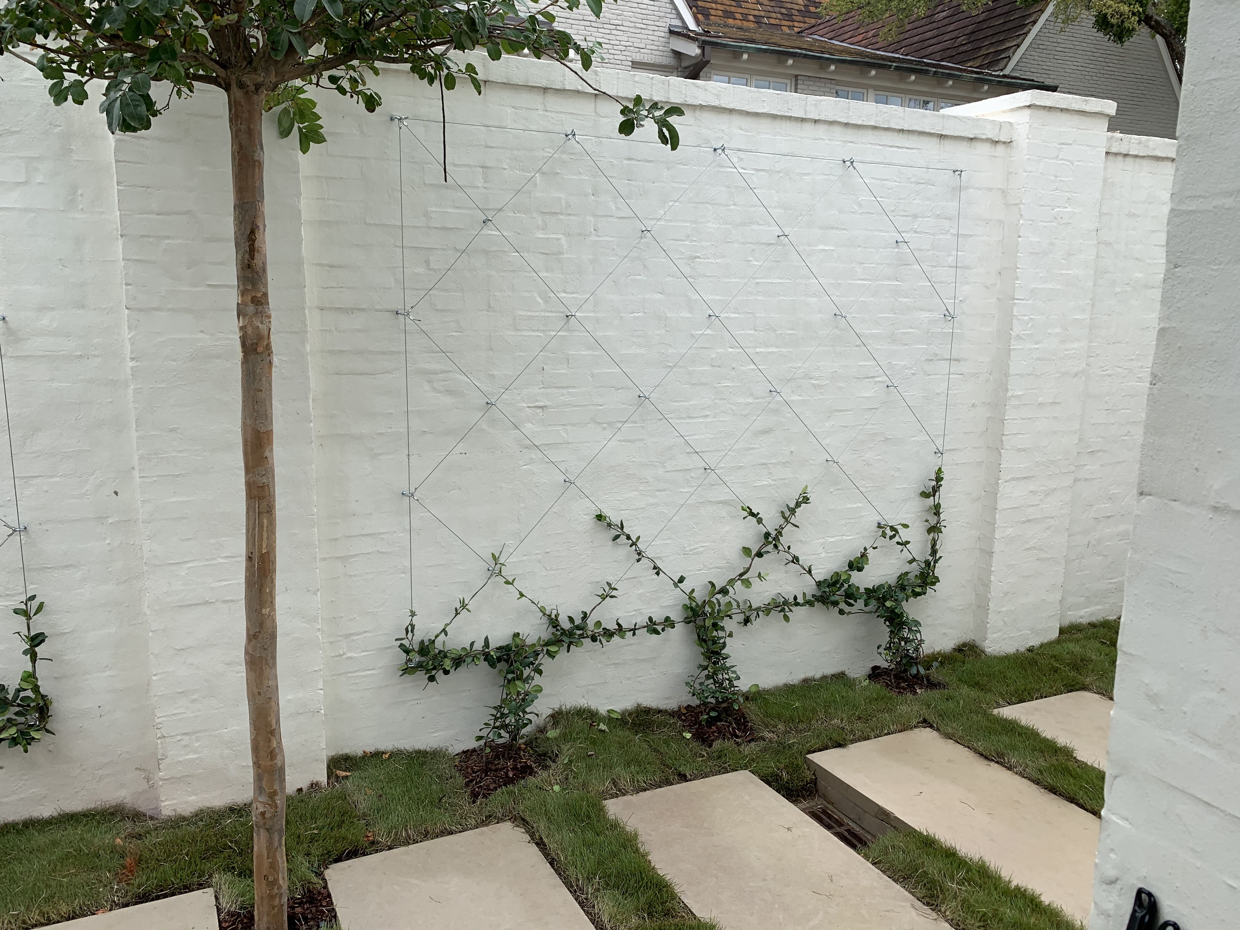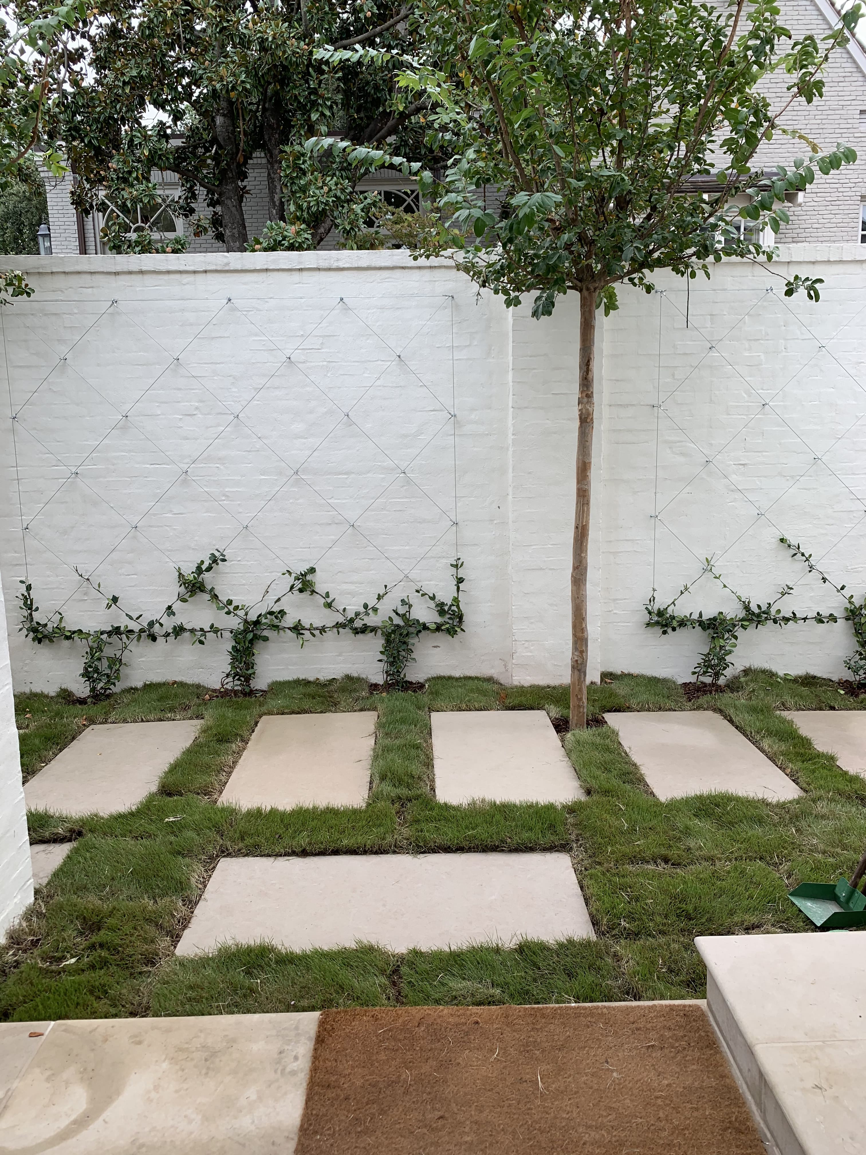 To break up the tall white walls, we installed espaliers that add structure, texture, and visual interest without overwhelming the space. The greenery softens the courtyard while maintaining a clean, refined look.
