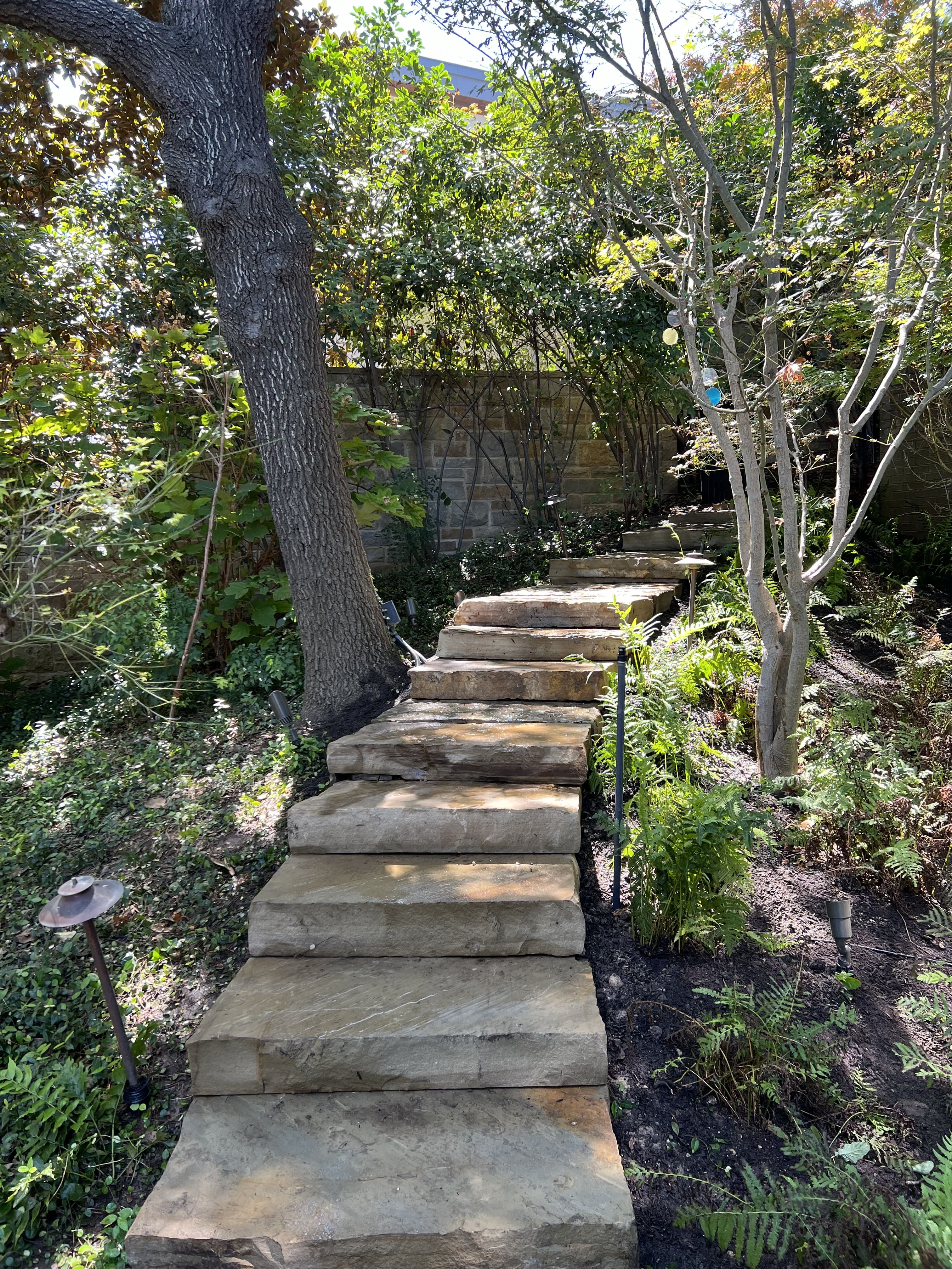 Unstable flagstones were replaced with curved Tumbleweed Swan Steps and landings to create a safe, smooth, and elegant transition.